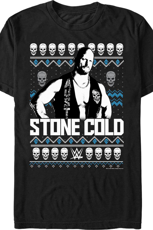 This "Stone Cold" Steve Austin t-shirt features an image of the wrestling legend posing in his ring entrance vest. The image includes skulls, and is designed to look like an ugly knit Christmas sweater.