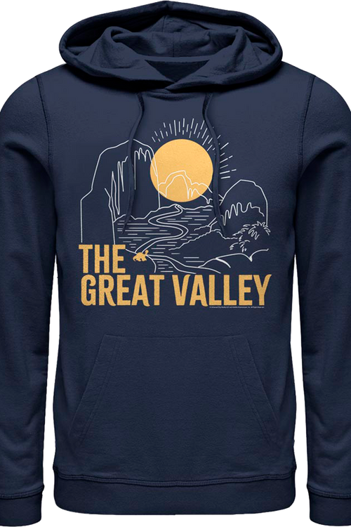 This Land Before Time hoodie features a sketch of the Great Valley, which includes a silhouette of Littlefoot.