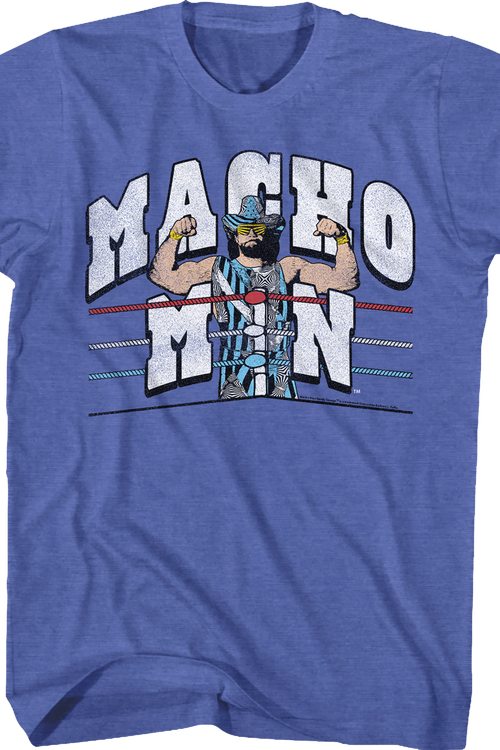 This "Macho Man" Randy Savage t-shirt shows the wrestling icon flexing before stepping into the squared circle to teach his next opponent all about macho madness.