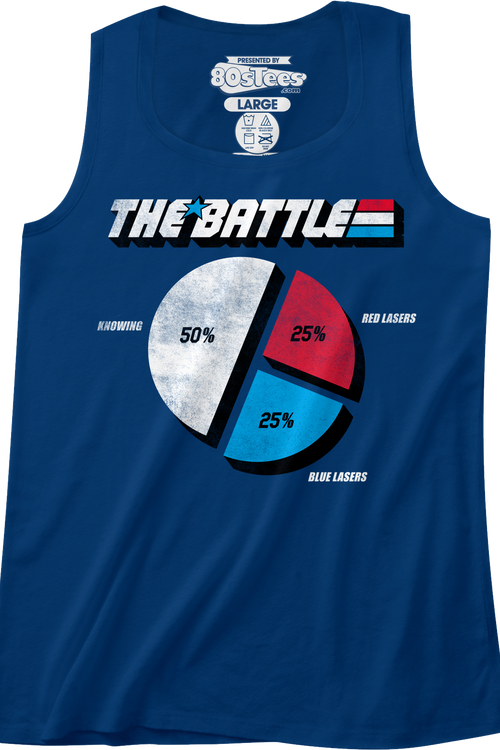 This 80sTees.com exclusive GI Joe tank top shows a pie chart that proves knowing is half the battle. The pie chart shows Knowing is 50%, Red Lasers are 25%, and Blue Lasers are 25%.