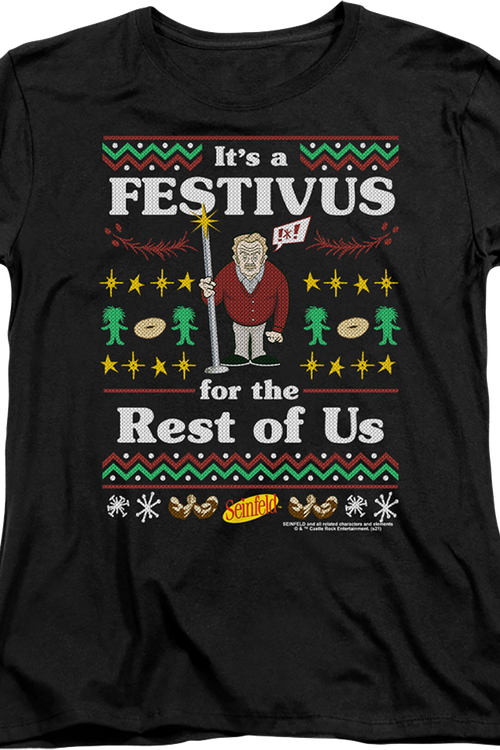 This womens Seinfeld shirt is designed to look just like an ugly knit Festivus sweater. The shirt shows Frank Costanza holding an aluminum Festivus pole, the silhouette of the doll that inspired Frank to start the Festivus holiday, the bagels from H&H Bagels, two arms in a feat of strength, and snowflakes. The shirt reads "It's a FESTIVUS for the Rest of Us."