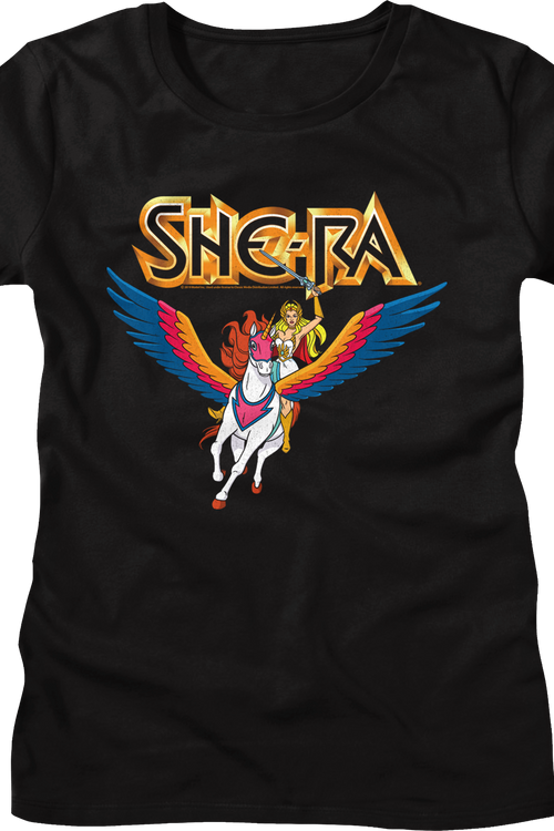This womens She-Ra shirt features an image of the Princess of Power on her unicorn Swift Wind. She-Ra is seen raising her Sword of Protection.